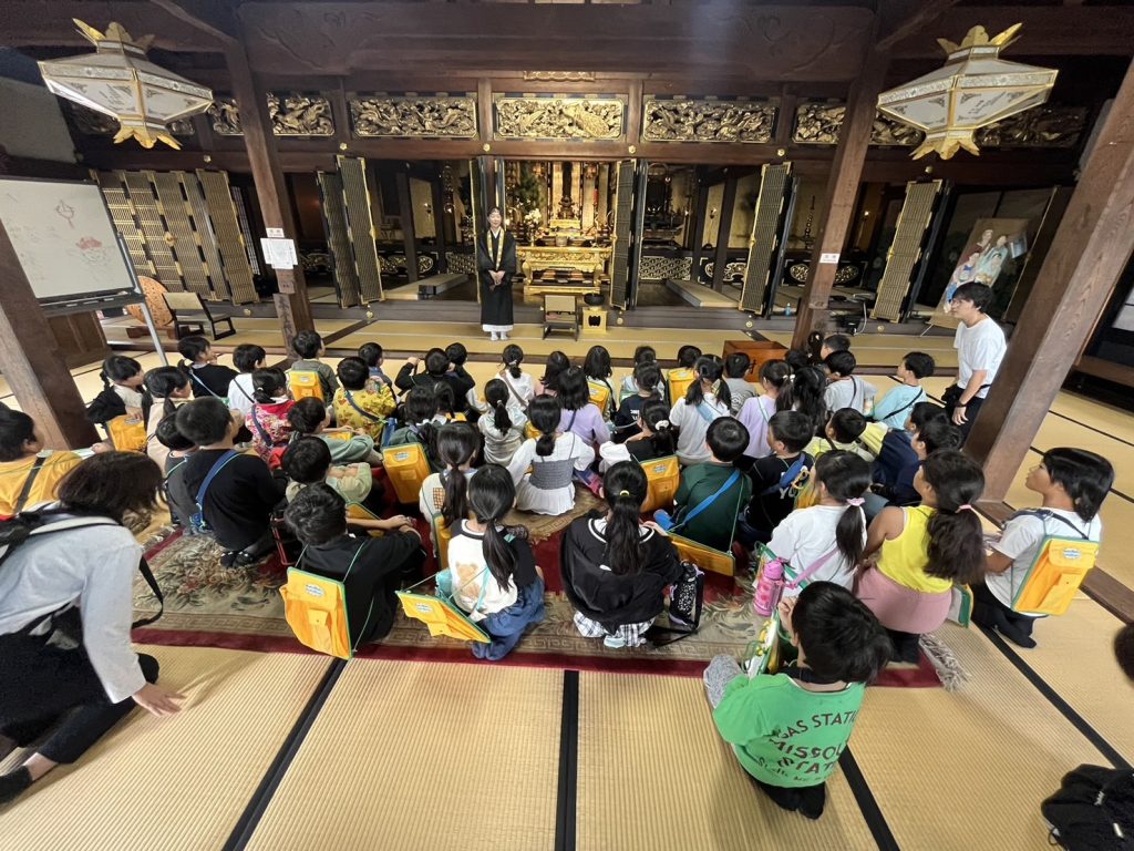 今日の朝9時に畝部小学校の2年生が「まち探検」の授業で先生と一緒に願成寺に訪れました。先生からは、本堂での振る舞いについてのマナーの指導があったり、住職からはお寺の役割や歴史についての話があり、みんな真剣に聴いていました。お話の後は全員のこどもから「お墓には幽霊がいるんですか」とか「なぜ金ぴかなんですか」とか色々な質問が飛び交っていました。